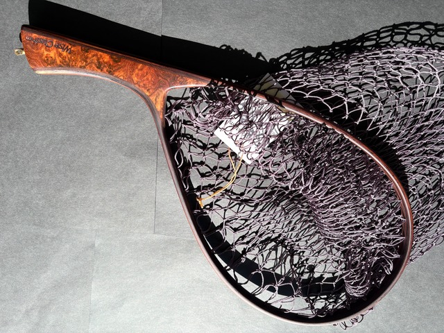 サクラマス、湖に最適なサイズです。 全長:80cm 全幅:36.5cm 間口:56.5cm 重量:360g グリップには、希少価値の高い“特上グレード”のアンボイナ花梨瘤材を使用。瘤ならではの複雑で美しい杢が、所有する喜びを引き立てます。 フレームには硬質で耐久性のあるチーク二層とローズウッド二層を重ね、強度と美しさを両立させました。 ウレタン塗装はナチュラルな艶消しで、自然な光沢を出すために高番手までサンドペーパーを掛けることにより手に馴染みやすいです。 熟練した技とこだわりを詰め込んだ、世界に一つだけの逸品です。 網の部分はランディングネット用の「手編みネット」です。 素材には強度と耐久性に優れた 5号クレモナ糸 を使用。ネット深さは 60cm。 グリーン、レッド、サーモンオレンジ系のグラデーションに仕上げました。 専属の編み職人がひと目ひと目ピッチを丁寧に合わせ、糸継ぎを最小限に仕上げています。 強度と美しさを兼ね備えた、安心して魚を受け止められる仕上がりです。 Made in Bali Indonesia