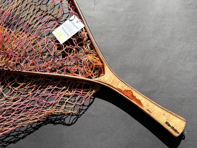 サクラマス、湖に最適なサイズです。 全長:80cm 全幅:37.5cm 間口:57.5cm 重量:380g グリップには、希少価値の高い“特上グレード”のアンボイナ花梨瘤材を使用。瘤ならではの複雑で美しい杢が、所有する喜びを引き立てます。 フレームには外からアカシア、チーク、ローズウッド、チークと四層に重ね、強度と美しさを両立させました。 ウレタン塗装はナチュラルな艶消しで、自然な光沢を出すために高番手までサンドペーパーを掛けることにより手に馴染みやすいです。 熟練した技とこだわりを詰め込んだ、世界に一つだけの逸品です。 網の部分はランディングネット用の「手編みネット」です。 素材には強度と耐久性に優れた 5号クレモナ糸 を使用。ネット深さは 60cm。 ピンク、オレンジ系のグラデーションに仕上げました。(最後の一本です) 専属の編み職人がひと目ひと目ピッチを丁寧に合わせ、糸継ぎを最小限に仕上げています。 強度と美しさを兼ね備えた、安心して魚を受け止められる仕上がりです。 Made in Bali Indonesia