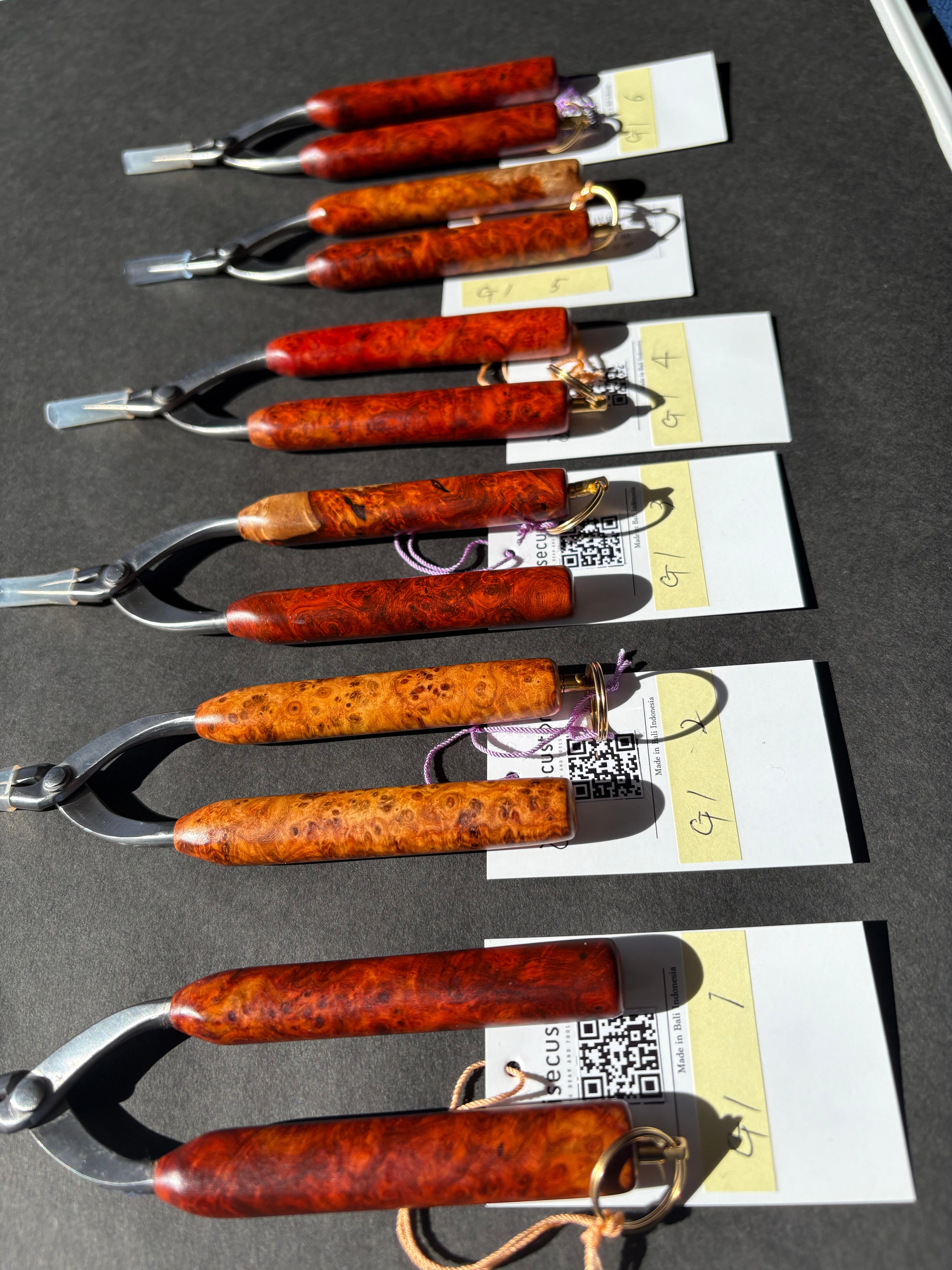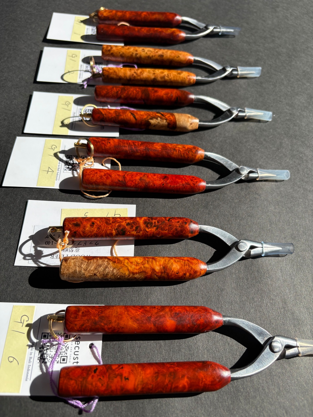 グリップには、手作りの花梨瘤材を使用しており、滑りにくい仕上がりが特徴です。このプライヤーは、フック外しやアイチューンなど、多用途に対応できるサイズ感が魅力で、使い勝手も抜群です。ステンレス製の刃と巧妙なデザインにより、耐久性も高く、長くお使いいただけます。