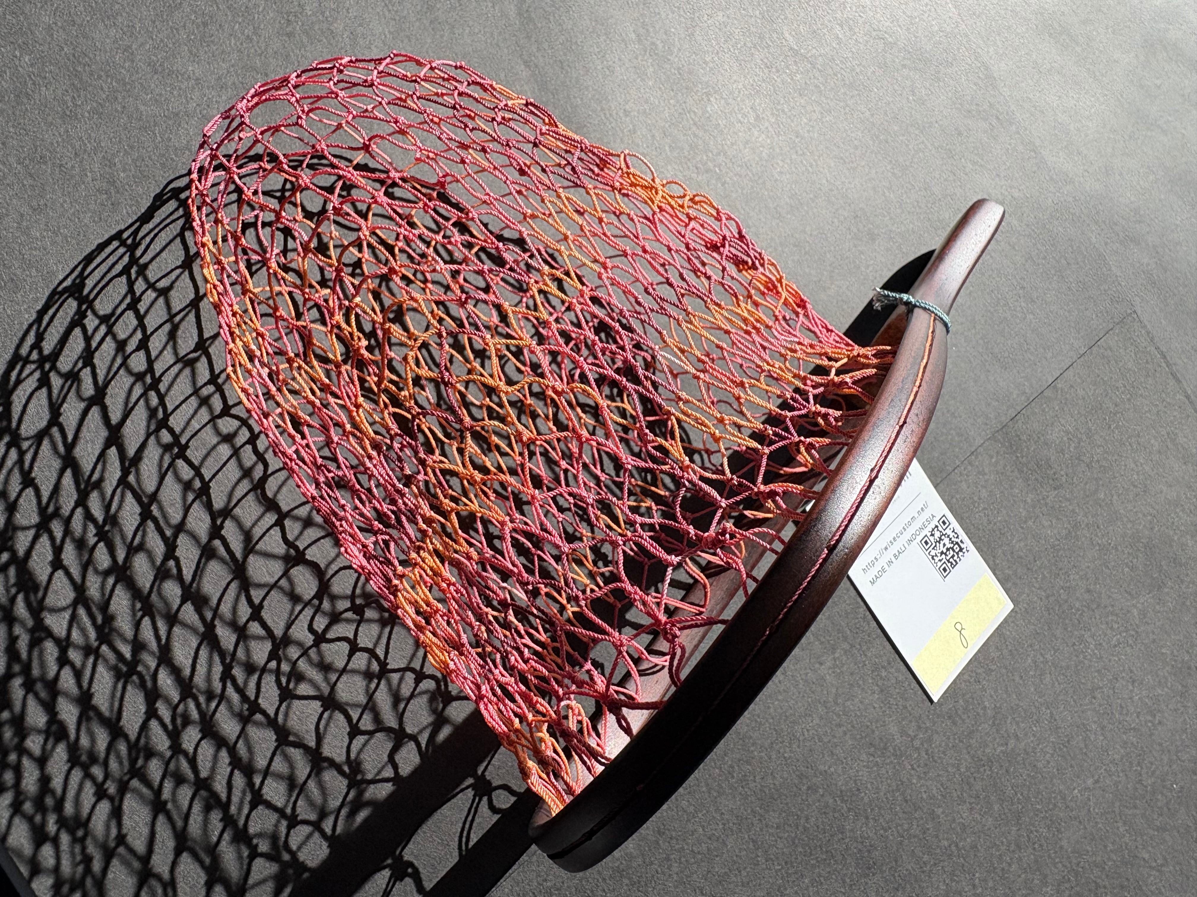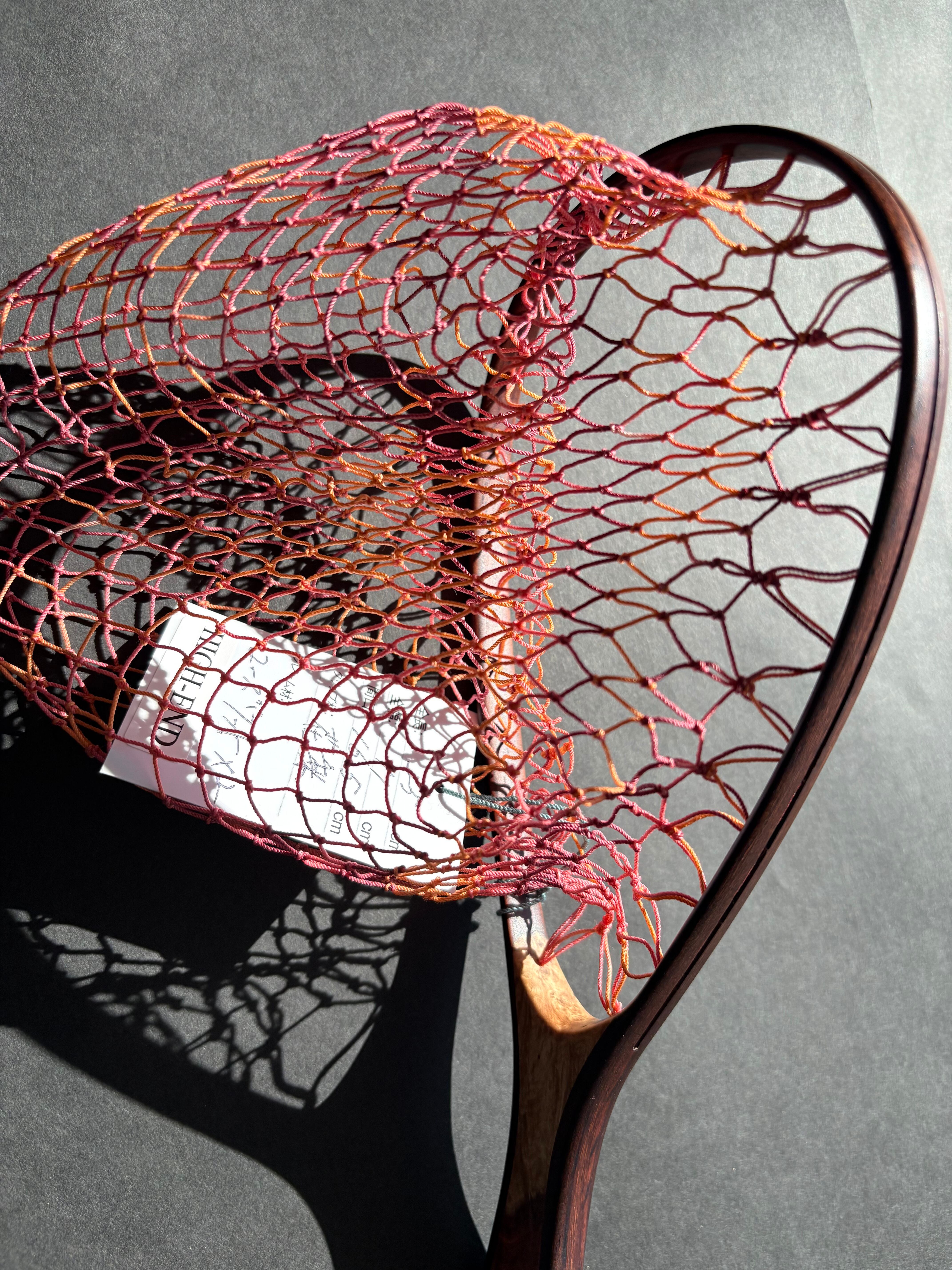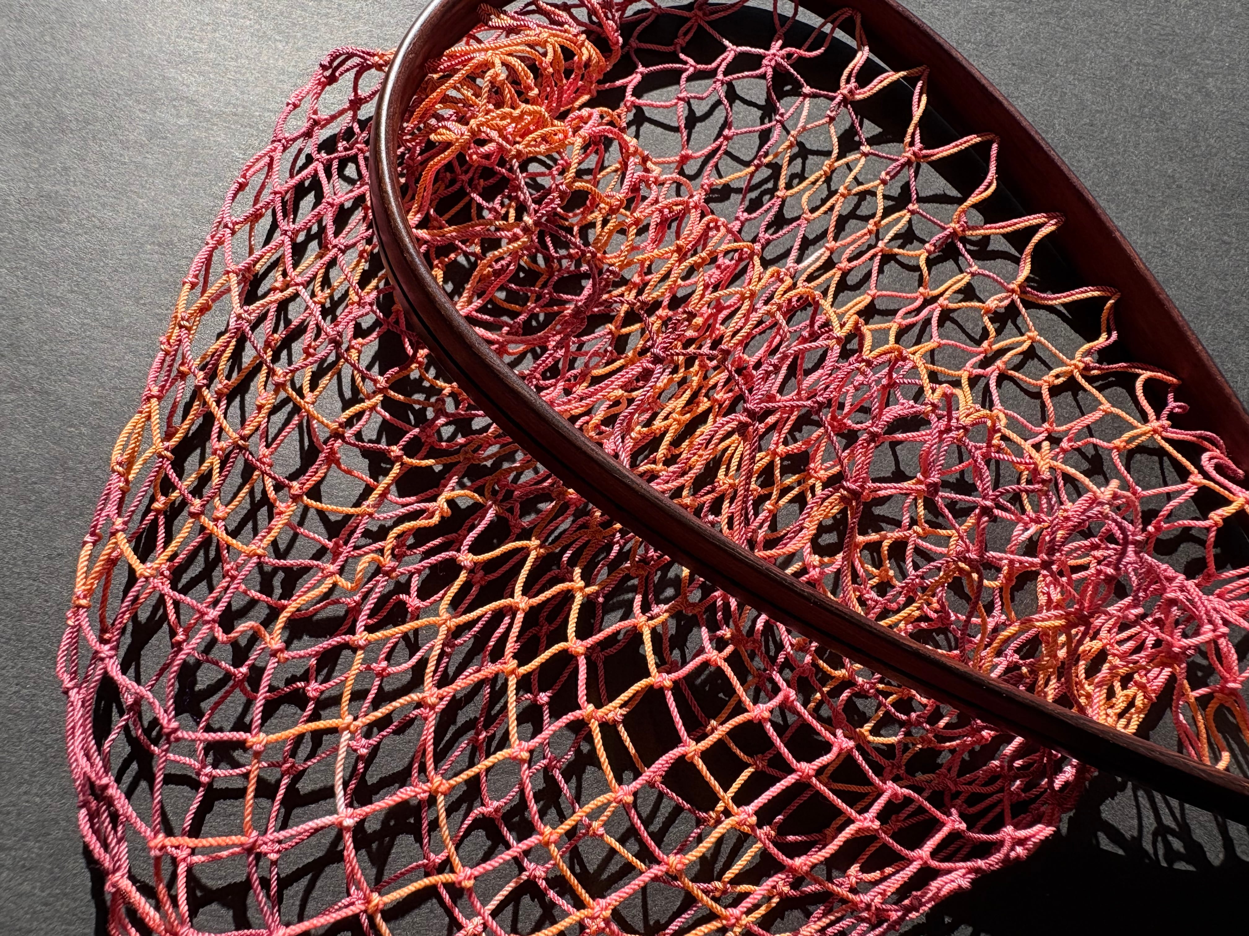 網の部分はランディングネット用の「手編みネット」です。オレンジ、ピンク、赤紫の3色グラデーションに仕上げました。
