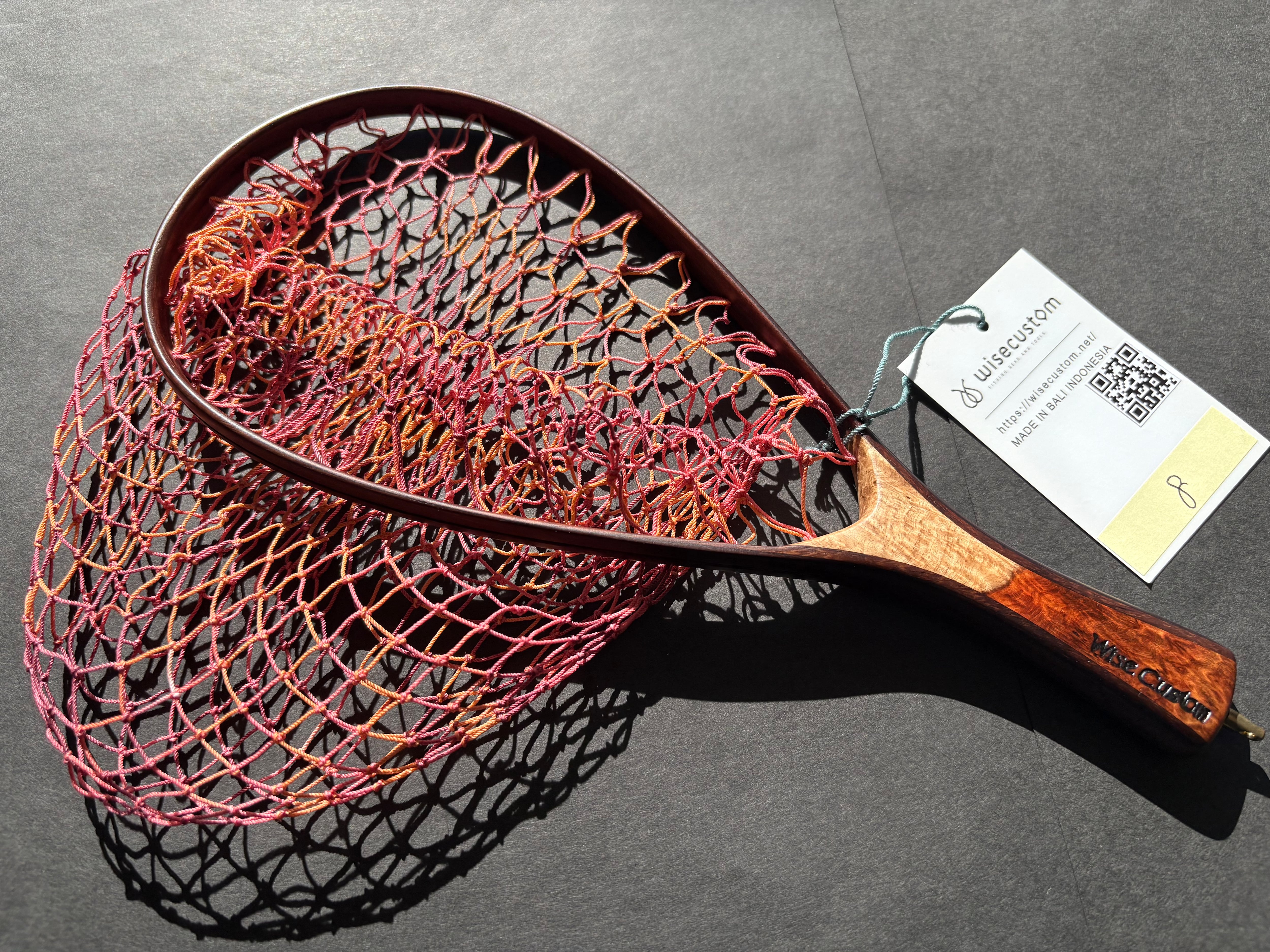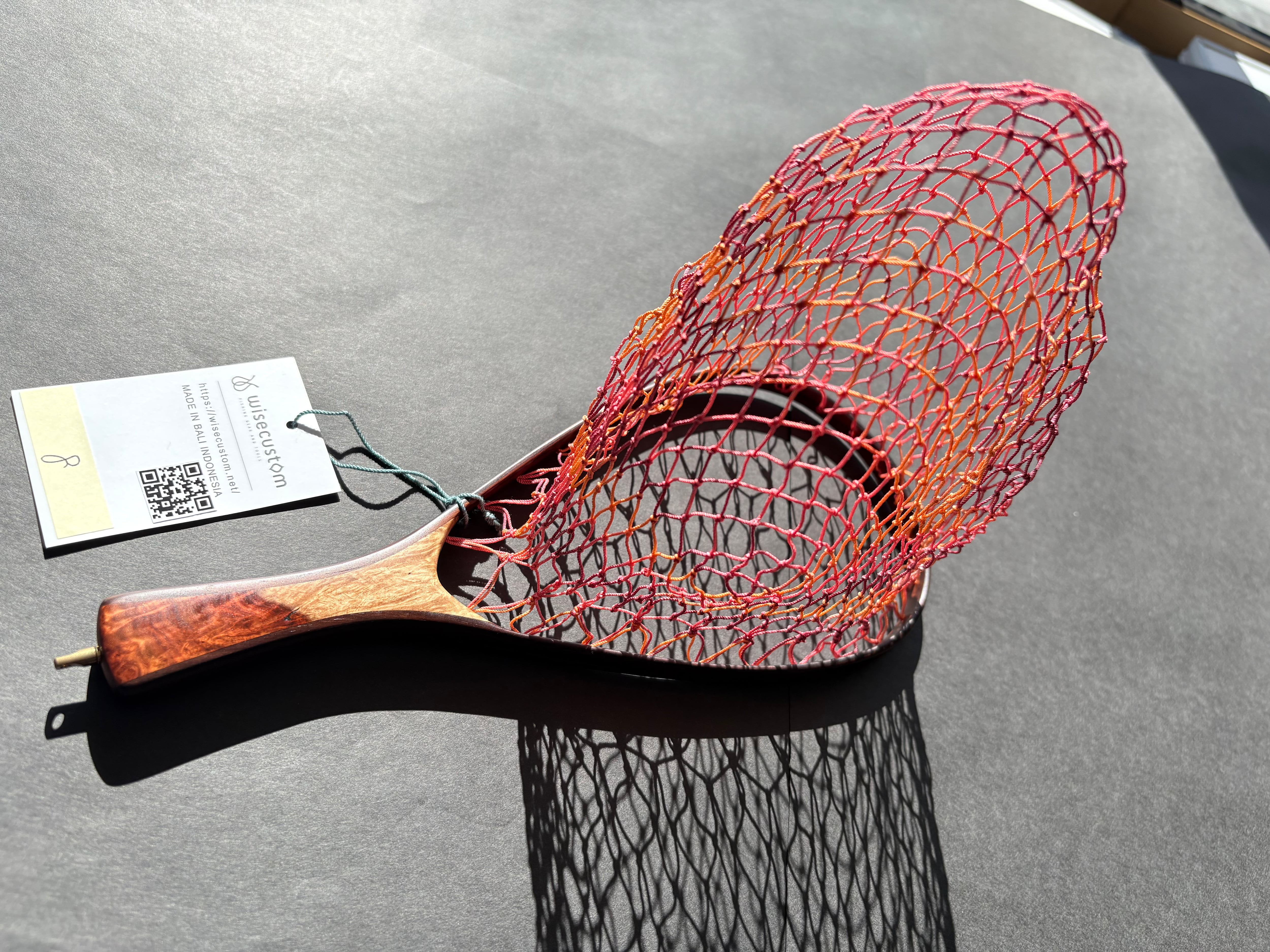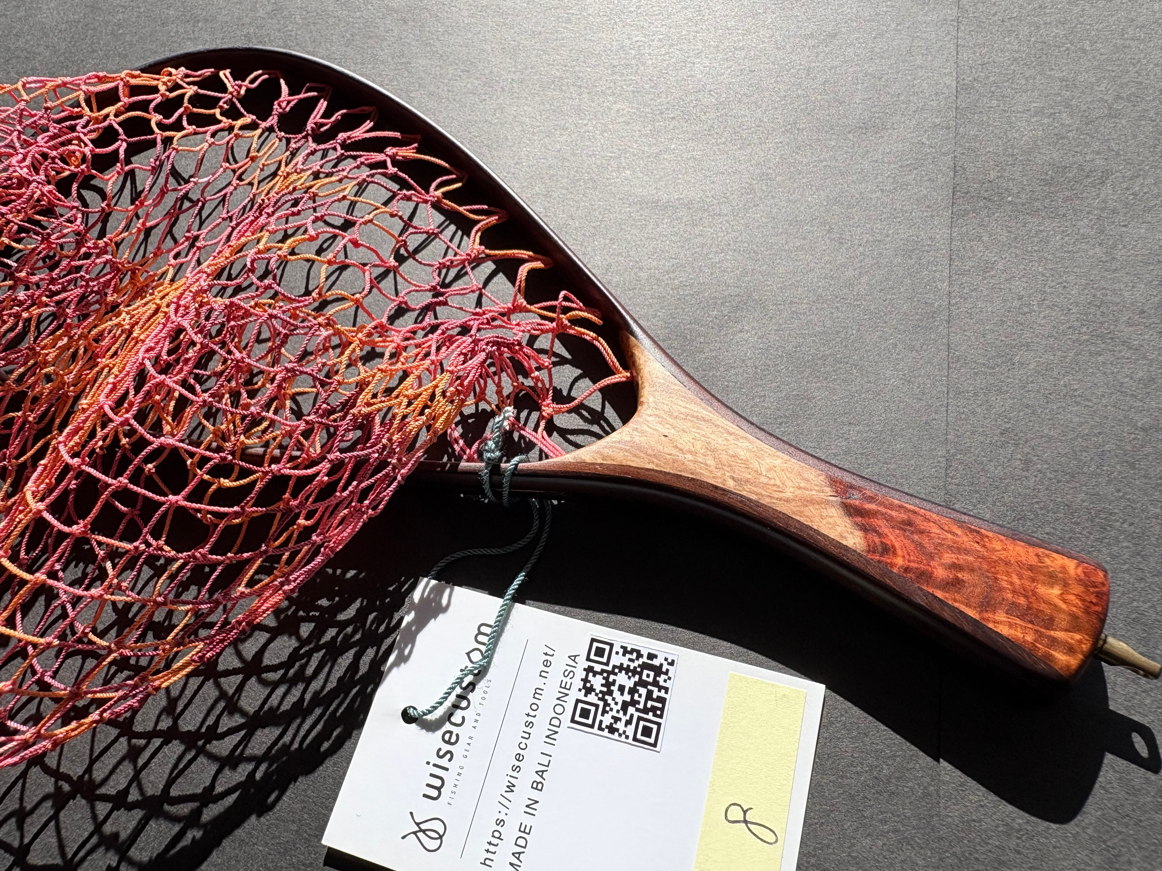 網の部分はランディングネット用の「手編みネット」です。オレンジ、ピンク、赤紫の3色グラデーションに仕上げました。