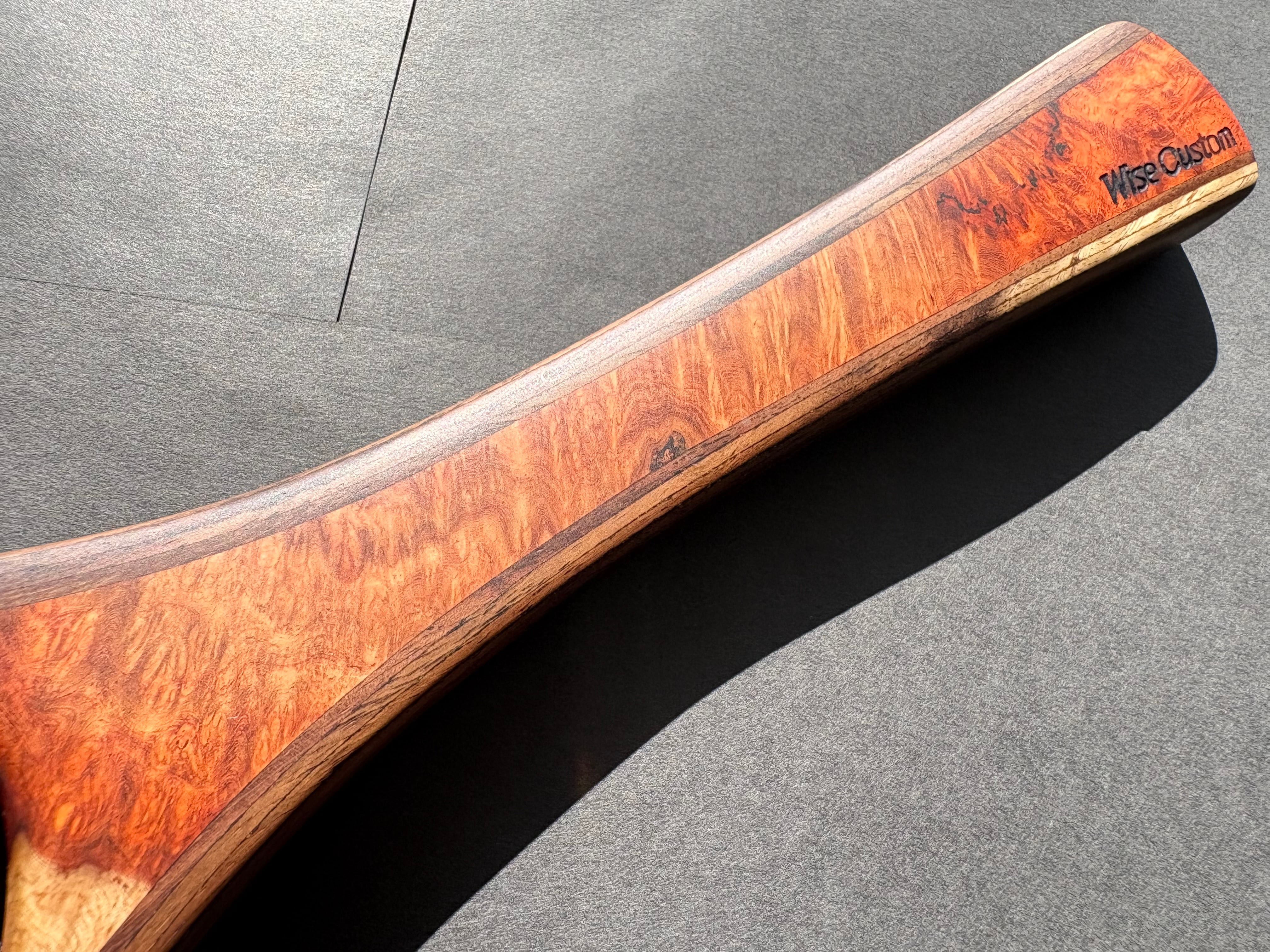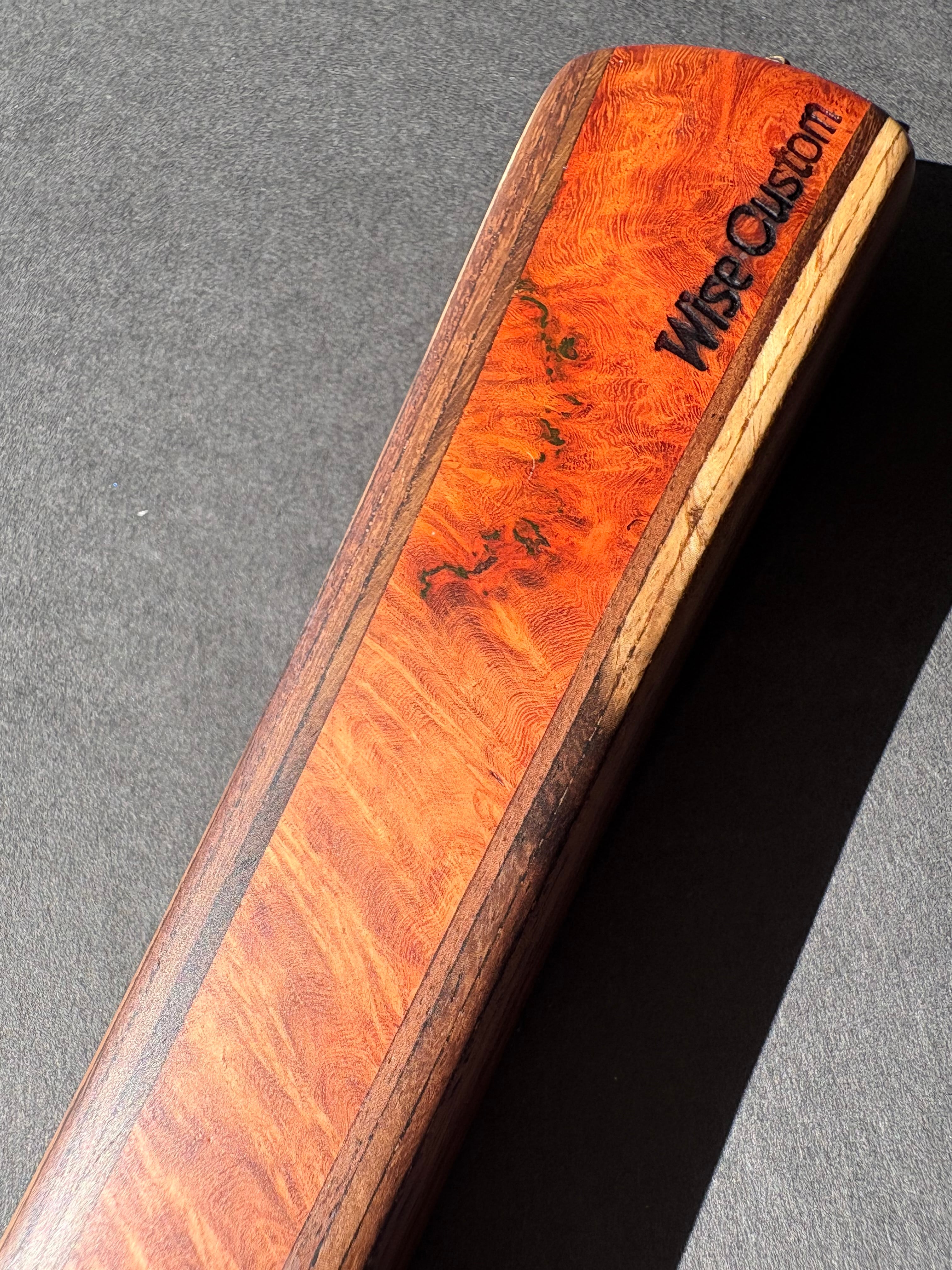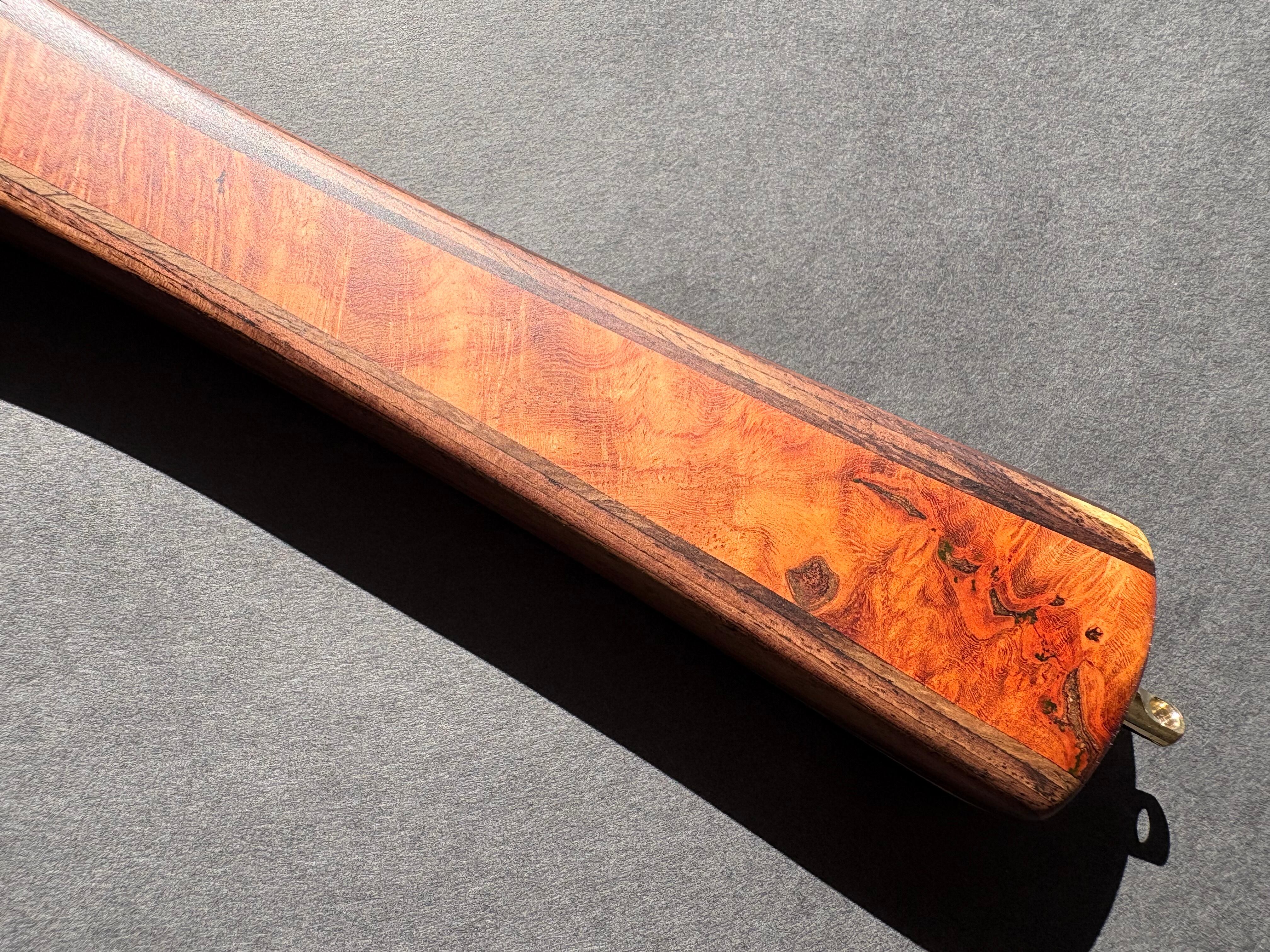 グリップには、希少価値の高い“特上グレード”のアンボイナ花梨瘤材を使用。瘤ならではの複雑で美しい杢が、所有する喜びを引き立てます。