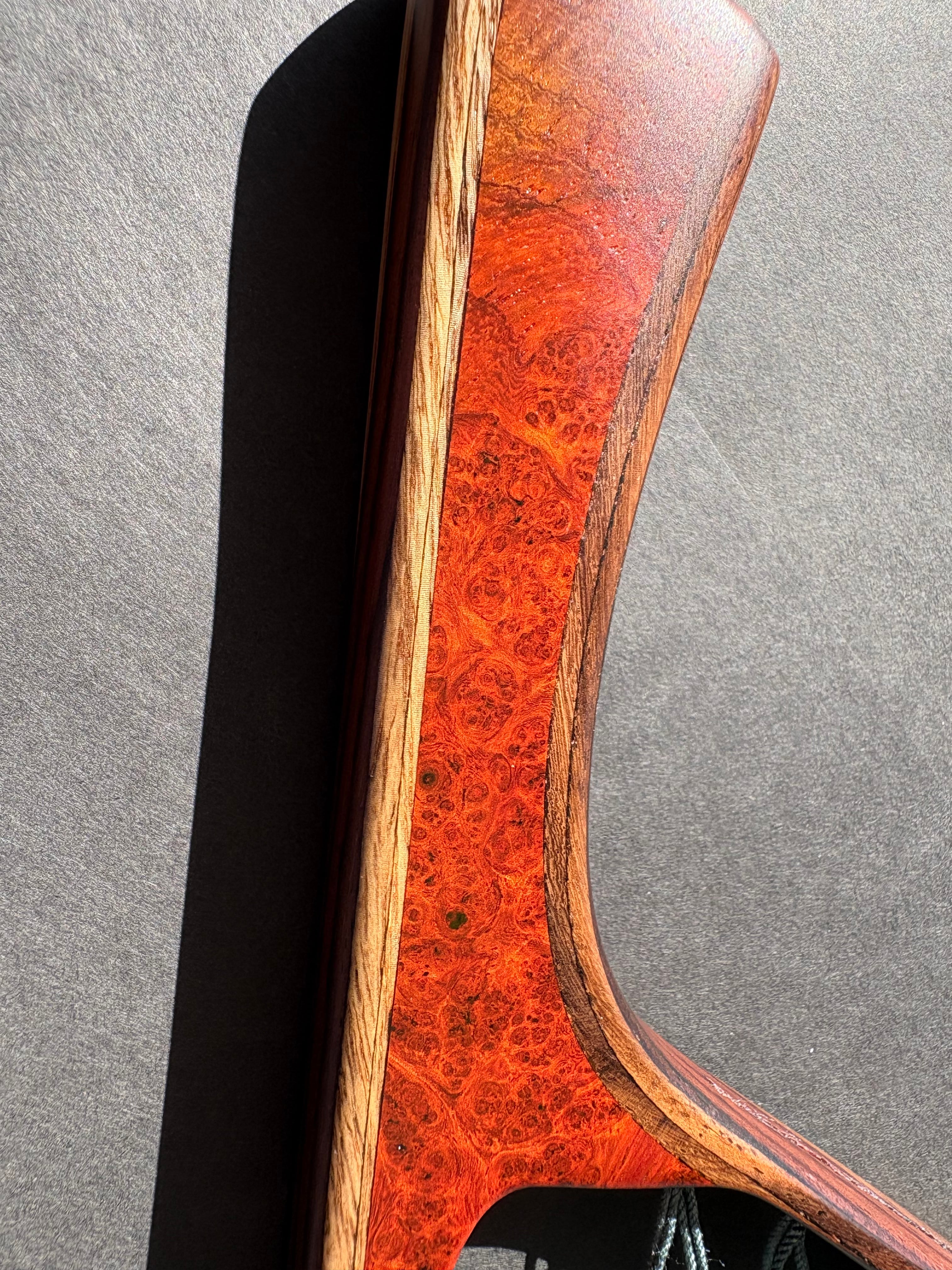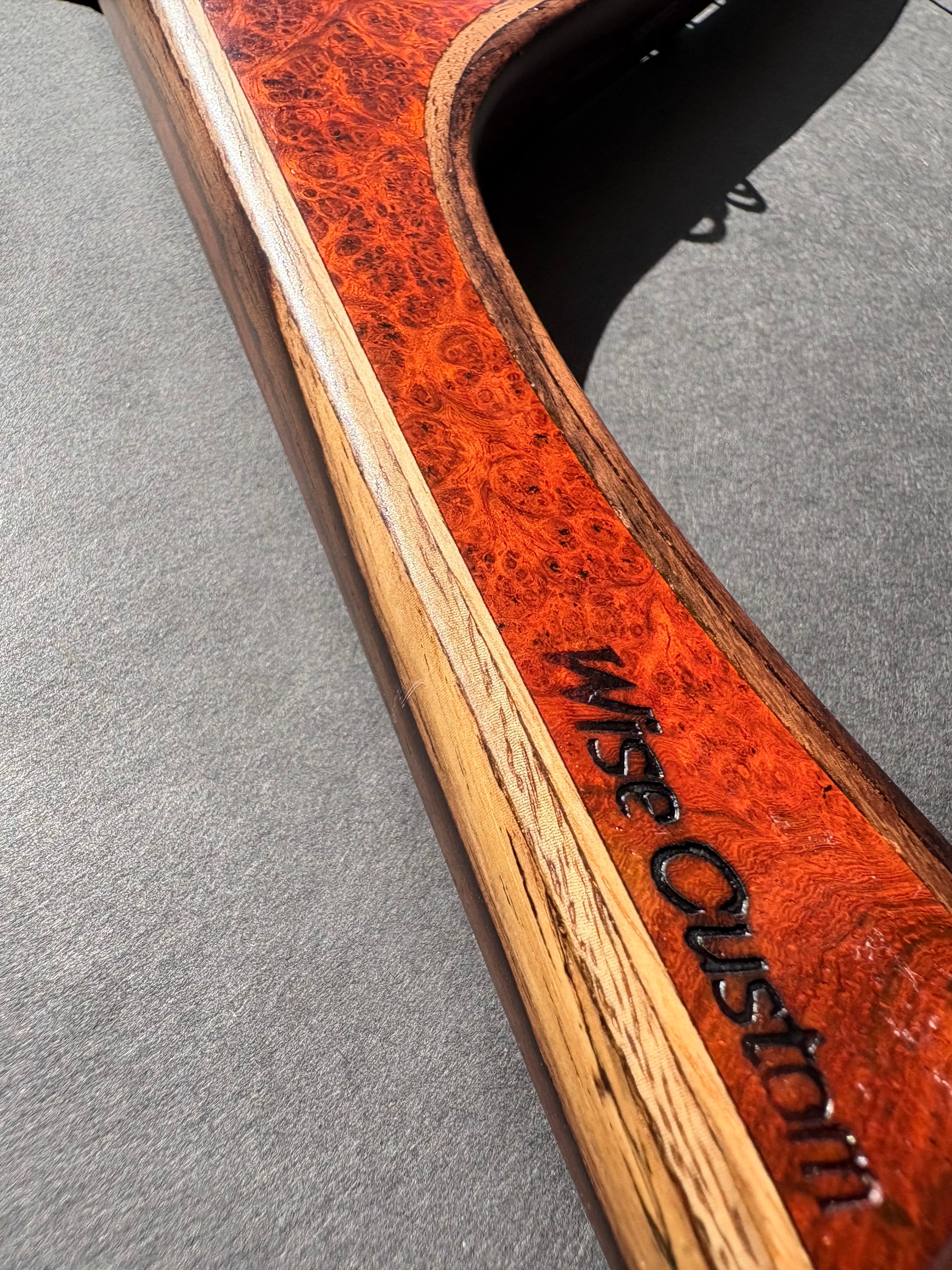 グリップには、希少価値の高い“特上グレード”のアンボイナ花梨瘤材を使用。瘤ならではの複雑で美しい杢が、所有する喜びを引き立てます。