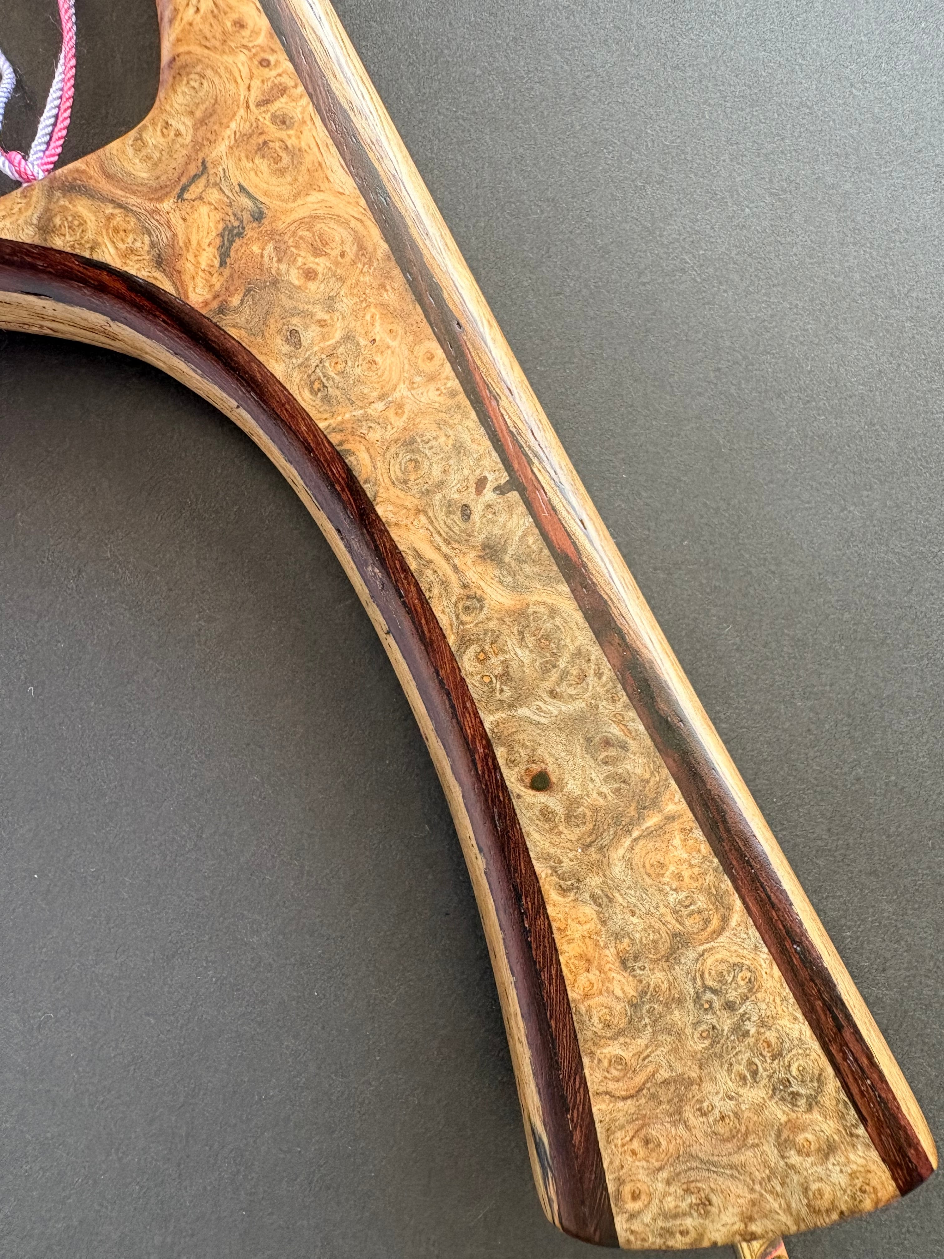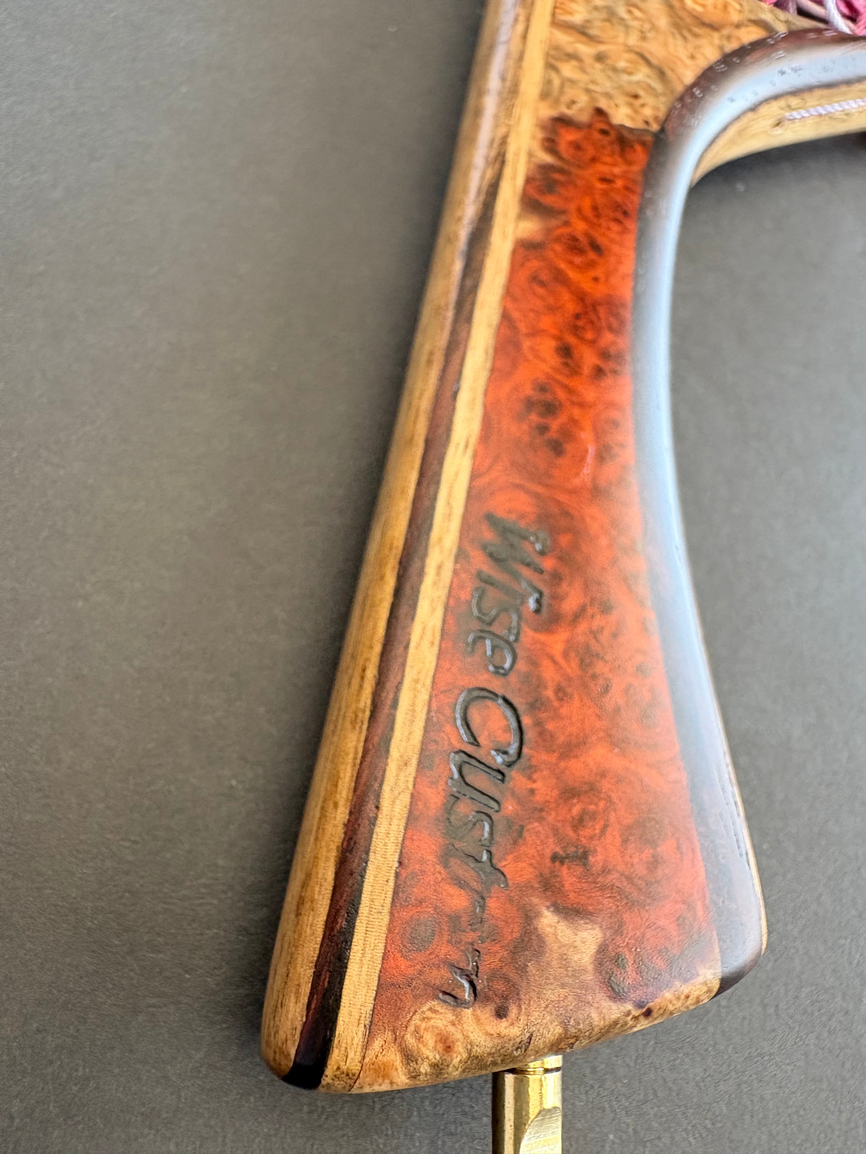 グリップには、希少価値の高い“特上グレード”のアンボイナ花梨瘤材を使用。瘤ならではの複雑で美しい杢が、所有する喜びを引き立てます。