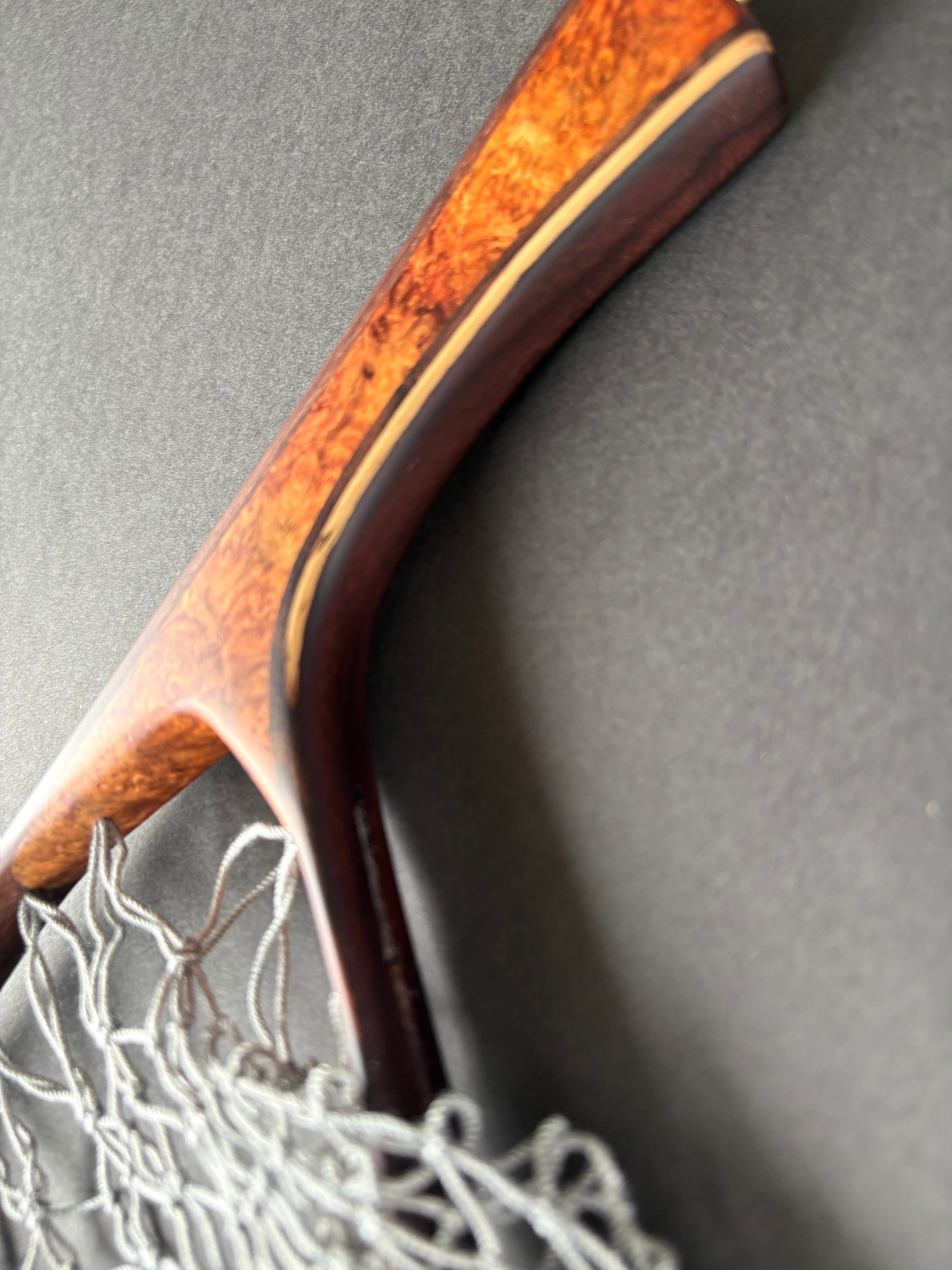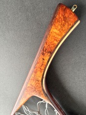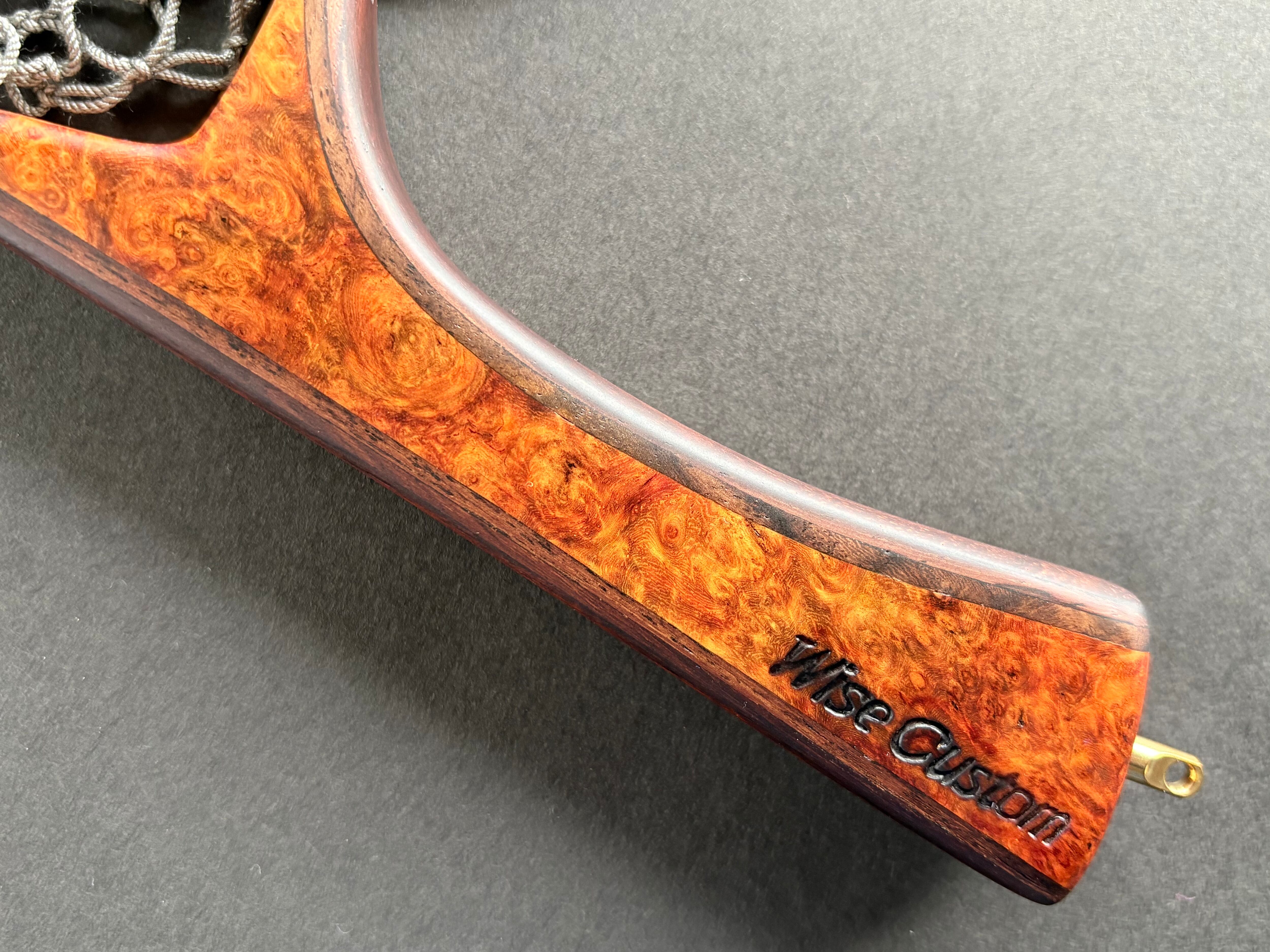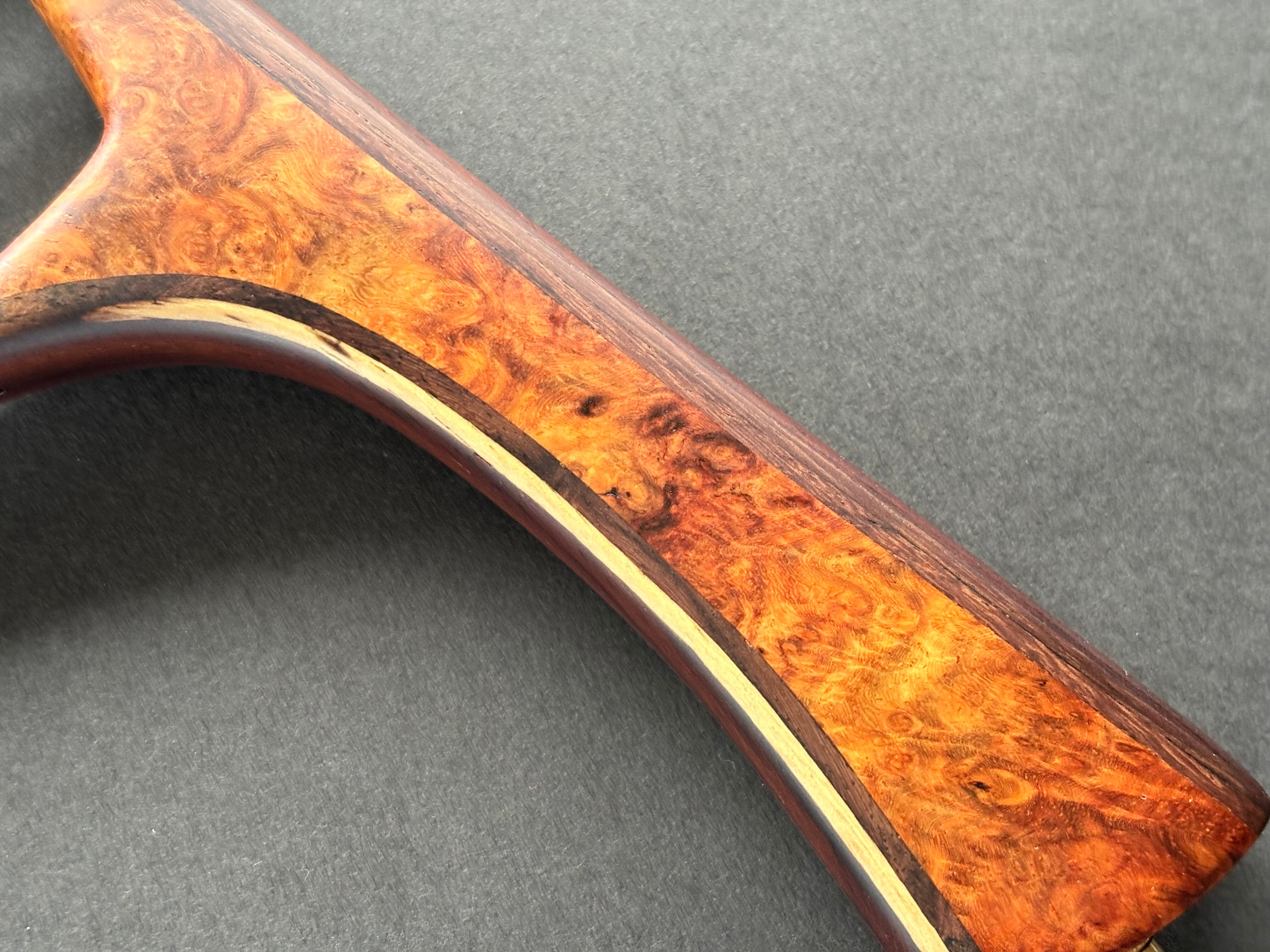 グリップには、希少価値の高い“特上グレード”のアンボイナ花梨瘤材を使用。瘤ならではの複雑で美しい杢が、所有する喜びを引き立てます。